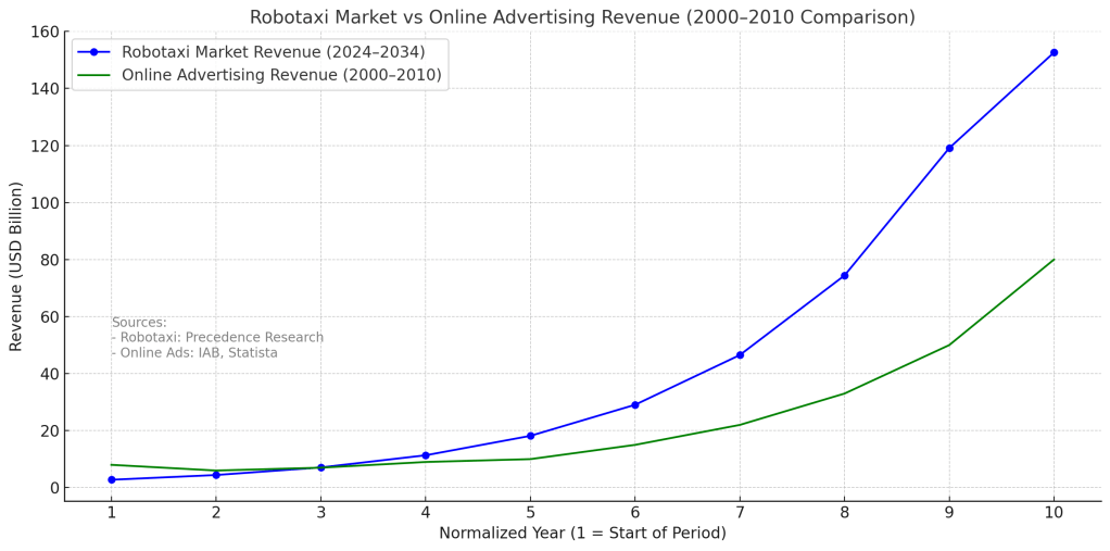 - Starting Point: Online ads began at $8 billion in 2000, a significantly higher base than robotaxis’ $2.77 billion in 2024.